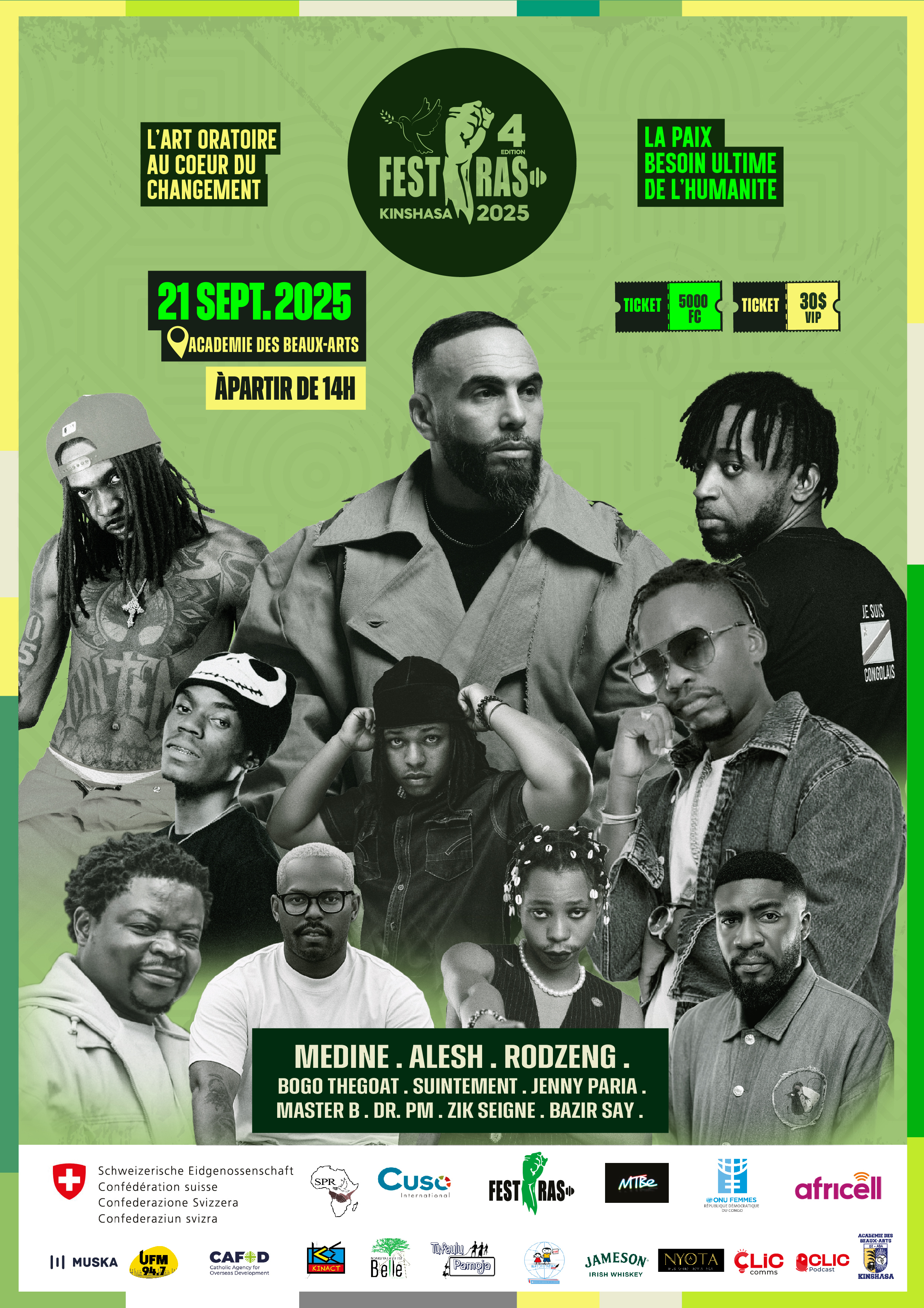 Le FESTIRAS, Festival du Rap et du Slam, revient pour sa 4e édition avec encore plus de force, d’engagement et de voix unies au service d’une cause plus grande que le divertissement : la paix dans l’Est de la République Démocratique du Congo.